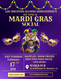Join us at Marquis II on Bissonnet starting at 5 PM on February 17 for a night of LSU spirit, LIVE MUSIC, great prizes, and Mardi Gras fun!
